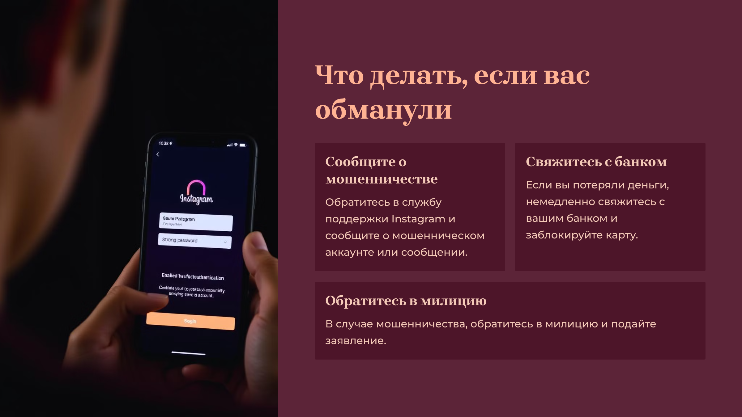 Будьте внимательны. Ни Instagram, ни магазин, ни друг никогда не попросят у вас пароль или код подтверждения. Любая спешка и давление — первый признак мошенника.